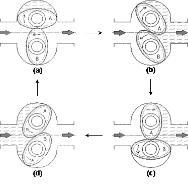 室內(nèi)壁形成一個新月形空間的液體——稱為“一份”(圖上以陰影表示)。齒輪A有一轉(zhuǎn)動力矩,而齒輪B上總力矩等于零,齒輪A帶動齒輪B轉(zhuǎn)動。圖2(b)是兩輪的中間位置。當(dāng)轉(zhuǎn)動到位置如圖2(c)所示時,齒輪A失去了轉(zhuǎn)動力矩,而齒輪B獲得了轉(zhuǎn)動力矩。齒輪B帶動齒輪A轉(zhuǎn)動,如圖2(d)所示。橢圓齒輪轉(zhuǎn)動角速度是非均勻的,每轉(zhuǎn)流過的液體量是圖中新月形腔的四倍,由傳感器將旋轉(zhuǎn)的總數(shù),以及旋轉(zhuǎn)的快慢傳遞給流量積算儀。