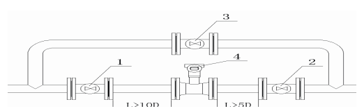 1 ·2 ·3 分別為前后閥和旁通閥;4 為流量計(jì),L≥10D 和L≥5D分別為前后直管段長(zhǎng)度,D為管道公稱(chēng)直徑。