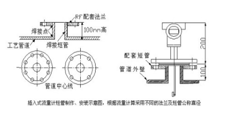 h、插入式流量計(jì)安裝時(shí),將短管及法蘭焊到管道上時(shí)必須確保流體正對(duì)著靶片受力面,焊接短管高度在100mm(從管道內(nèi)壁至法蘭密封面的距離);(圖9)